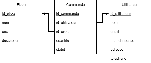 Une base de données est particulièrement utile quand elle connectée à une application. Avec Python, cela est par exemple possible grâce au module sqlite3. Sur cette page, ce module a déjà été chargé. De plus, la base de données de l'application de commande d'une pizzeria a été créée. Son schéma relationnel est donné ci-dessous.