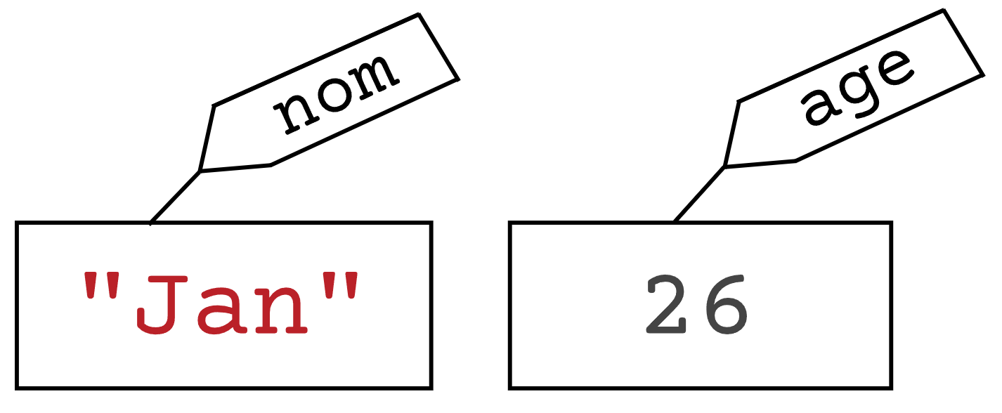 En programmation, l'un des concepts fondamental est celui de variable. Ce terme désigne en fait la mémoire du programme. Une variable permet de stocker une valeur dans la mémoire du programme et de lui donner un nom. On peut se représenter une variable comme une boîte dans laquelle on range une valeur et sur laquelle on colle une étiquette indiquant son contenu. De manière schématique, on a donc ci-dessous deux variables. La première, appelée nom, contient le texte "Jan". La variable age contient quant à elle la valeur 26.